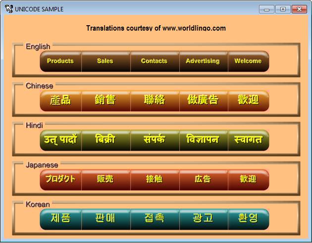 Thanks to the full integration of 3D Active Button Magic with our 3D Button Visual Editor application, you have the possibility to edit button based controls at design-time from inside your development environment and see the behaviour they would have at run-time. 3D Active Button Magic is fully UNICODE compliant, so you will have the possibility to use it with the various languages (such as Hindi, Japanese, Chinese, Korean, etc.) that make use of double-byte characters.