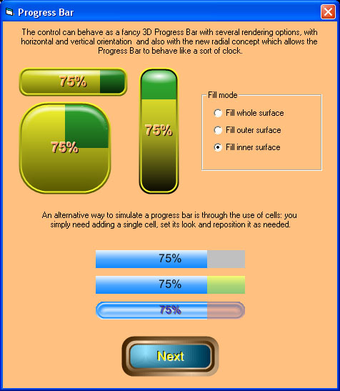Creating 3D Progress Bars is also a very easy task; apart from the standard horizontal and vertical look, you can now create progress bars with a radial look: