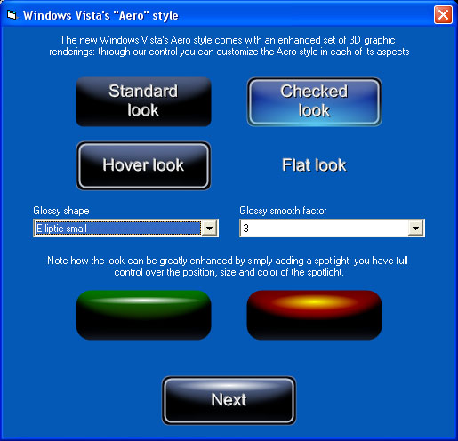 The new Vista's Aero style will certainly enhance your user interface: each single color composing the Aero look can be changed through dedicated properties: