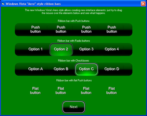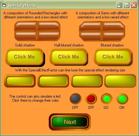 Some of the styles available for the button. It can be used as an alternative to standard Frames controls and standard Picture controls (with the capability of displaying GIF and AVI animations). A great new style is the enhancement of the standard Option (Radio) buttons and Checkboxes with transparency support.