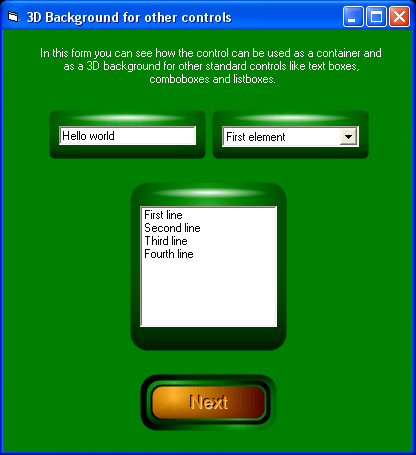The control can be used as a background for other standard controls like edit boxes, lisboxes and comboboxes; as you can see the final effect is really outstanding
