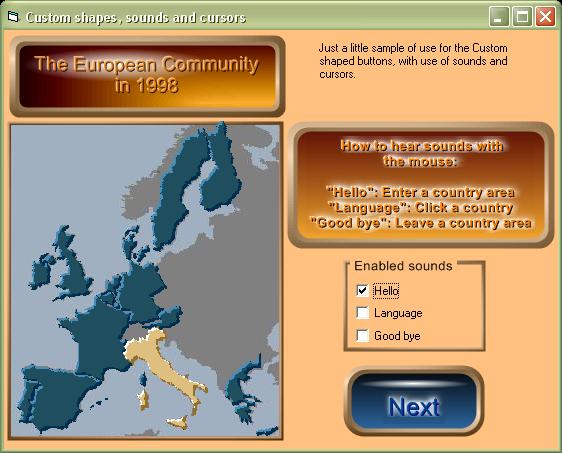 A screenshot of the 1998 European Community members. Every country is rendered using a custom shaped button and every country has its own mouse pointer. The country under the mouse pointer changes its color. This dialog box, contained in the demo program, performs sounds when the mouse enters, leaves or clicks a country.