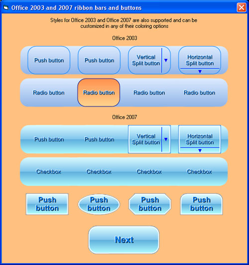Some of the styles available for the button. It can be used as an alternative to standard Frames controls and standard Picture controls (with the capability of displaying GIF and AVI animations). A great new style is the enhancement of the standard Option (Radio) buttons and Checkboxes with transparency support.