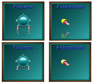 Pictures and animations can be displayed in transparency over the button surface and their reflectivity can be enabled and configured as seen on the set of buttons below: the 2 upper buttons have picture reflectivity enabled, the 2 lower buttons have picture reflectivity disabled.