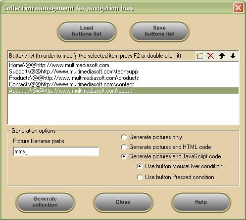 3D Button Visual Editor can easily manage button collections and navigation bars with "two-states" and "three-states" rollover effects . If needed, it can generate the rollover HTML and JavaScript code for insertion into your web pages.