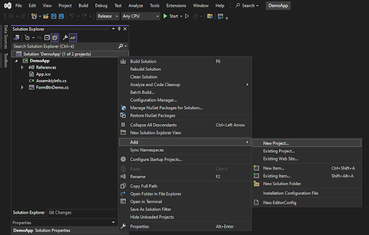 | 3. | Inside the "Solution Explorer" toolbar right-click the solution's name and select "Add / New project..." from the context menu |