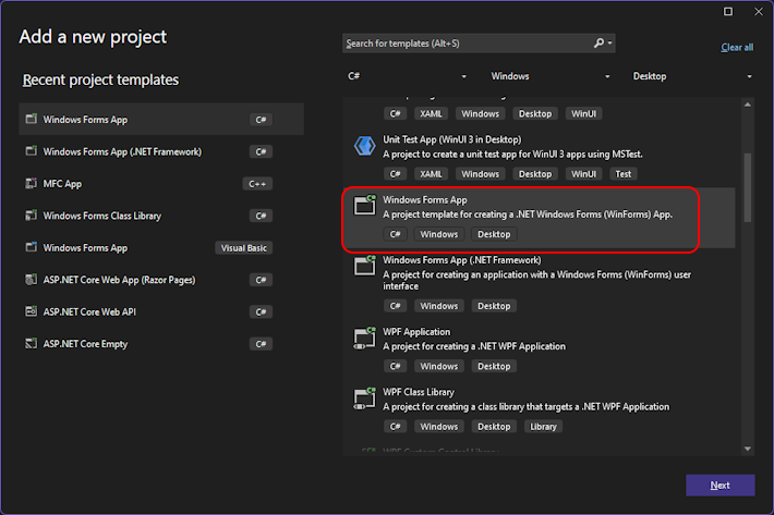 | 5. | Select the "Windows Forms App" project template fro the list of available templates |