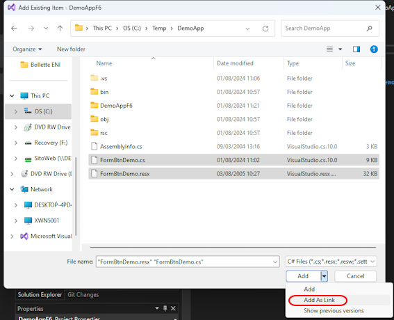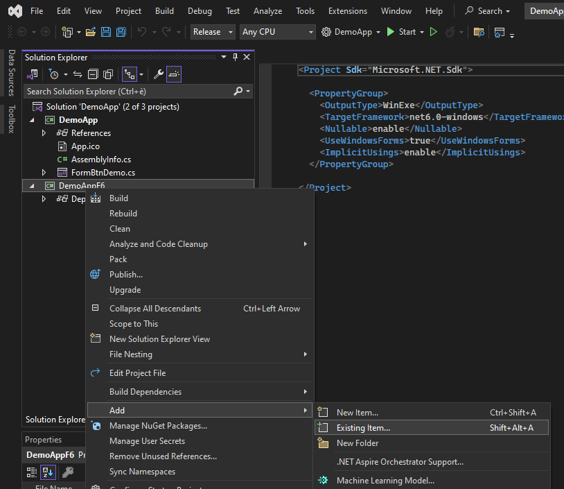 | 10. | Right-click the DemoAppF6 project and select "Add / Existing Item..." from the context menu |