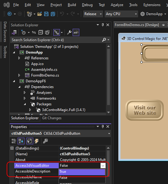 | 16. | Select one single instance of the control and go to the "Properties" toolbar, locate the Access3dVisualEditor property inside the "Properties" toolbar of the control and change its value from "False" to "True": this will launch the visual editor and will display the control. |