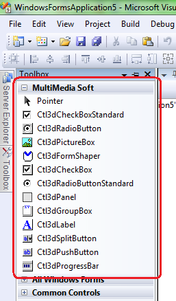 When versions 2010 and/or higher are chosen the installation procedure creates two tabs inside the toolbox of the corresponding IDE, one for the component built against version 2.0 of the .NET framework (named "MultiMedia Soft for .NET FW 2") and one for the component built against version 4 of the .NET framework (named "MultiMedia Soft for .NET FW 4") as seen on the screenshot below (*):