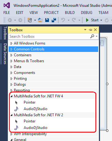 When versions 2010 and/or higher are chosen the installation procedure creates two tabs inside the toolbox of the corresponding IDE, one for the component built against version 2.0 of the .NET framework (named "MultiMedia Soft for .NET FW 2") and one for the component built against version 4 of the .NET framework (named "MultiMedia Soft for .NET FW 4") as seen on the screenshot below: