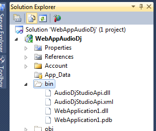 | • | In order to work on the server, the API needs to find multimedia engines AdjMmsEng.dll and AdjMmsEng64.dll: for this purpose you should add them to the project. By default, during the publishing phase, the assembly of the web application and assemblies of referenced APIs are installed on the server inside the "bin" sub-folder of the web application's main folder: our multimedia engine should be installed there too. Usually the "bin" folder is not visible on the "Solution explorer" window so we should make it visible by selecting the "Project/Show All Files" menu item of Visual Studio. At this point we could see the "bin" folder like this: |