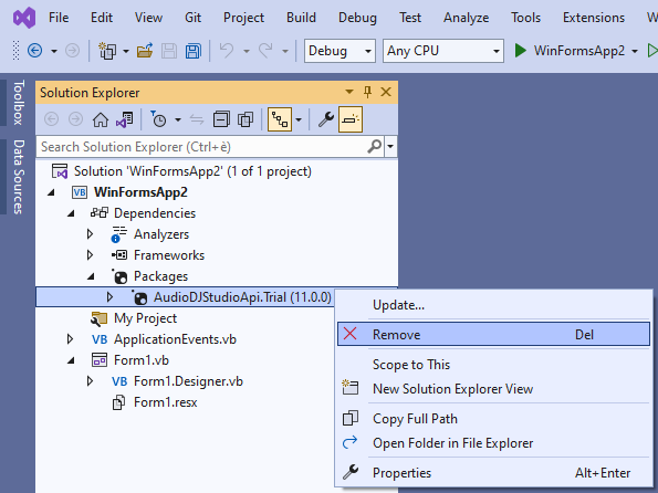 | • | Right click the "AudioDjStudioApi.Trial" item and select the "Remove" menu item as seen below: |