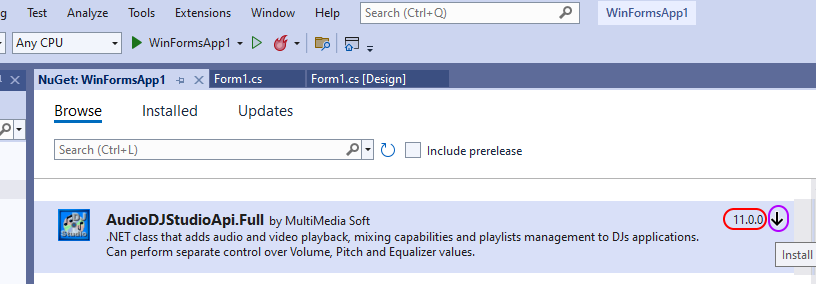 | • | The screenshot above is related to the usage of the stand alone Audio DJ Studio API for .NET setup package; In case you should have installed the complete "Audio Sound Suite for .NET" setup program (which includes both the Audio Sound Recorder and the Audio Sound Editor components) the NuGet Package Manager would display the following: |