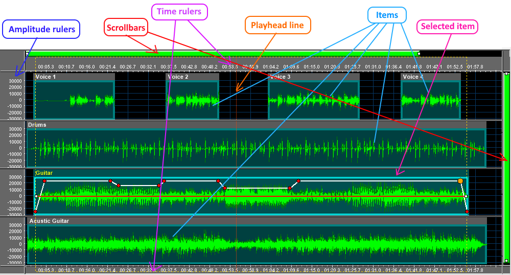 | • | Various tracks, each containing the waveform representation of one or more items; if enabled, each item can have a title text positioned on top or bottom of the waveform |