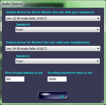 The following is the first dialog that will appear allowing to choose the audio output device, the set of speakers and some other initial parameter.