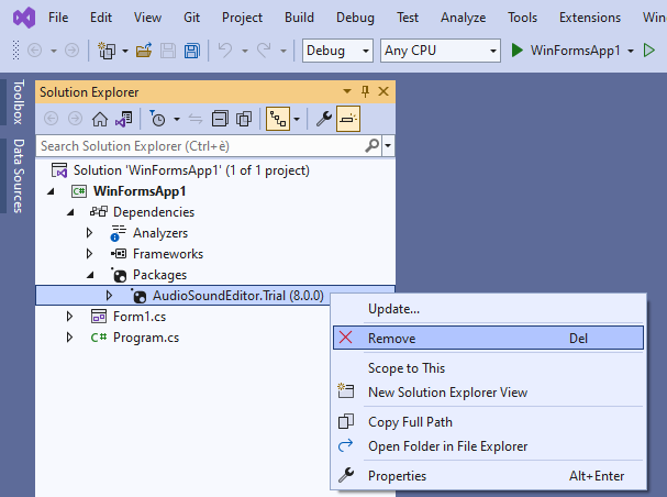 | • | Right click the "AudioSoundEditor.Trial" item and select the "Remove" menu item as seen below: |
