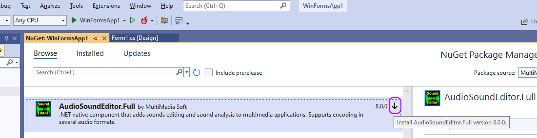 | • | As explained above for the Trial version, open again the NuGet Package Manager and select the "MultiMedia Soft packages" source |