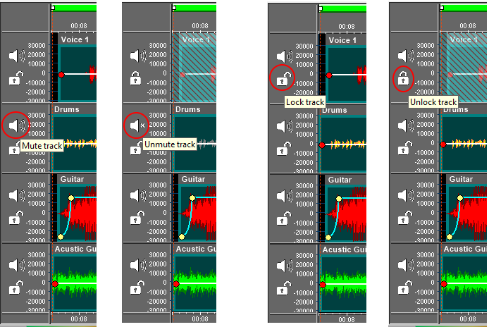 Each control icon can have two bitmaps representing two different situations; on the screenshot below, taken from the TracksBoard sample project available with the installer, two control icons are added, one providing the possibility to mute / unmute the track and the other one providing the possibility to lock / unlock the track; by default each track is in "unmute" status and in "unlock" status (status 1); when in status 1 the tooltip text represents what will happen after clicking the control icon with the mouse: once clicked, the bitmap will show the "mute" status (status 2) and the tooltip text will show that, by clicking the control again, the track will be brought back to the "unmute" status (status 1).