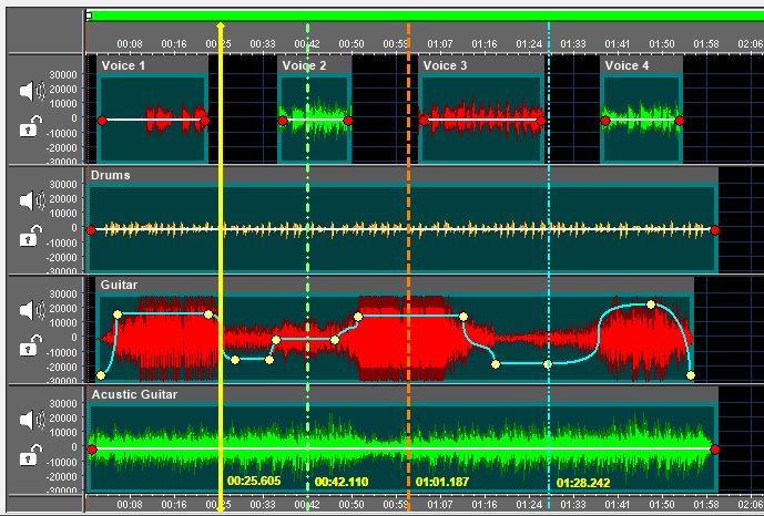 On the screenshot below you can see a set of four vertical lines displayed over the session, each with its own color, set of properties and position: