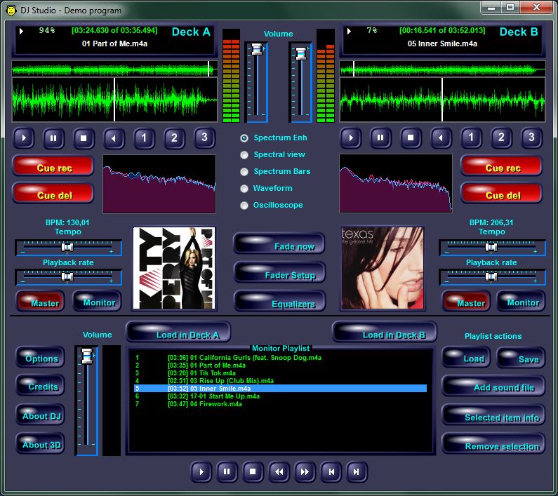 - Audio DJ Studio API for .NET: adds sounds playback, mixing capabilities and playlists management to DJs applications. Supports MP3, WAV, Ogg Vorbis, CD tracks, Shoutcast streams and other formats. The use of DirectSound allows the allocated players to have a separate control over Volume, Tempo, Playback Rate, Pitch and Equaliser values: visual feedback is provided through embedded VU-Meter, Spectrum Analyser, Oscilloscope and Waveform display.