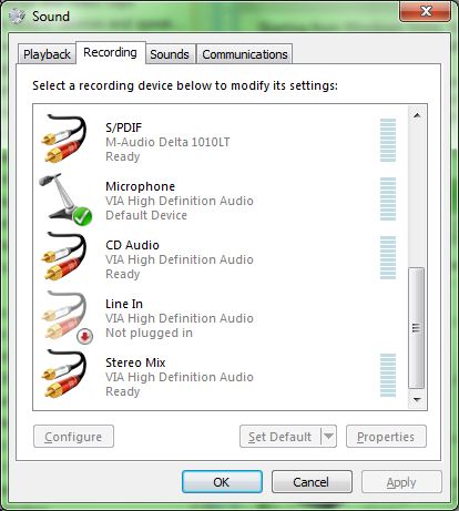 Another example, this time for render devices, is the possibility to set if and how the CD Audio, the Microphone and the Line In channel will work as playback devices. When available, these settings can be accessed through the Control Panel in the following way: