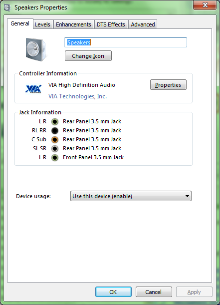 Each audio endpoint device is displayed by the Control Panel with a set of information as seen in the following image: