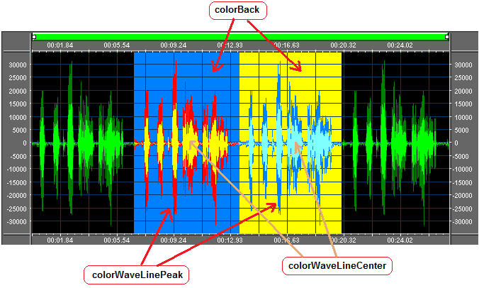 NOTE: If values of the colorWaveLineCenter e colorWaveLinePeak fields should be identical, the rendering would keep count of the bUseHalfColorsForPeaks field of the WANALYZER_WAVEFORM_SETTINGS data structure.