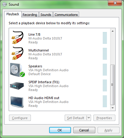 | • | select a render device (in this case we will use the "Speakers" device implemented by the "VIA High Definition Audio" driver) |
