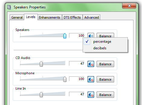 from the "Sound" applet of the control panel you can decide which unit of measure adopt by clicking the edit box of the volume with the right mouse button: after the click the context menu with available units of measure will appear as seen on the screenshot below: