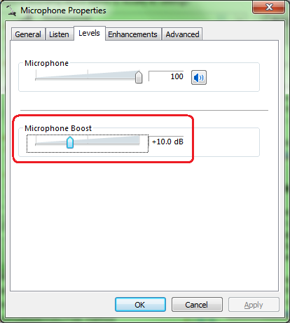| • | select the "Levels" tab: if the driver implements microphone boost you should see something similar: |