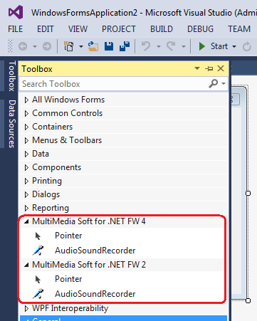 When versions 2010 and/or higher are chosen the installation procedure creates two tabs inside the toolbox of the corresponding IDE, one for the component built against version 2.0 of the .NET framework (named "MultiMedia Soft for .NET FW 2") and one for the component built against version 4 of the .NET framework (named "MultiMedia Soft for .NET FW 4") as seen on the screenshot below: