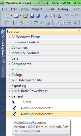 | • | As you can see there are two versions of the component: the one with assembly name "AudioSoundRecorderF4" is intended for usage with container applications targeted for .NET framework 4 or higher while the one with assembly name "AudioSoundRecorder" is intended for usage with container applications targeted for .NET framework 2.0, 3.0 or 3.5 so you may decide which of the two version best fits your needs. |
