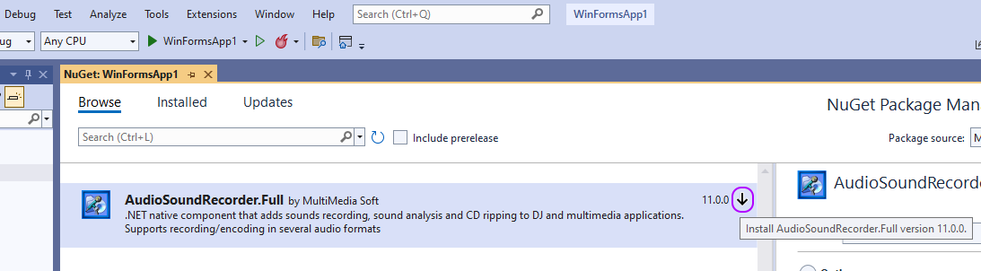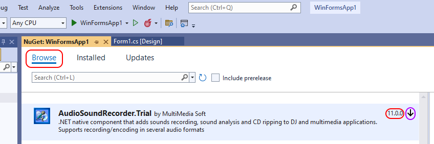 | • | Once selected, after clicking the "Browse" tab, all of the MultiMedia Soft NuGet packages installed on the development machine will be displayed (in this case a Trial version of the component) |
