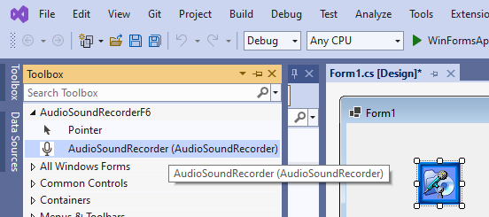 | • | Open the "Toolbox" and drag the AudioSoundRecorder component into the container form: this will display the component's icon inside the form; the icon will be visible at design-time only and hidden at runtime |