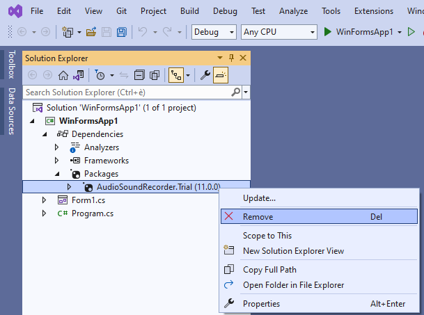 | • | Right click the "AudioSoundRecorder.Trial" item and select the "Remove" menu item as seen below: |