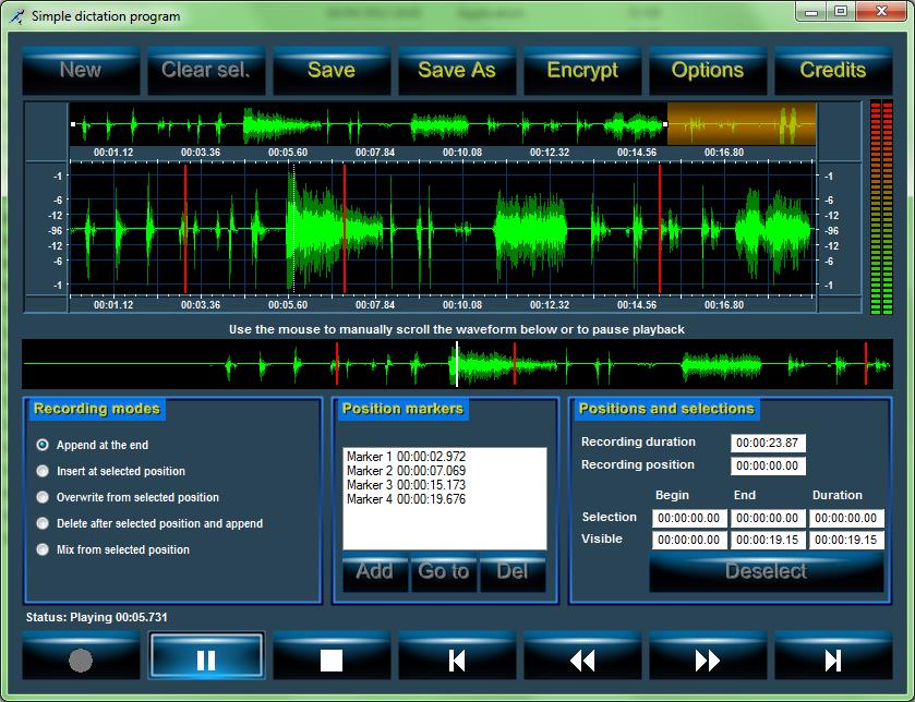 Audio Sound Recorder API for .NET supports deep analysis of the recorded sound waveform with rich visualisation capabilities including range selection, zooming and panning. Recorded sounds can be edited, resampled, mixed with other sounds and exported to different formats.