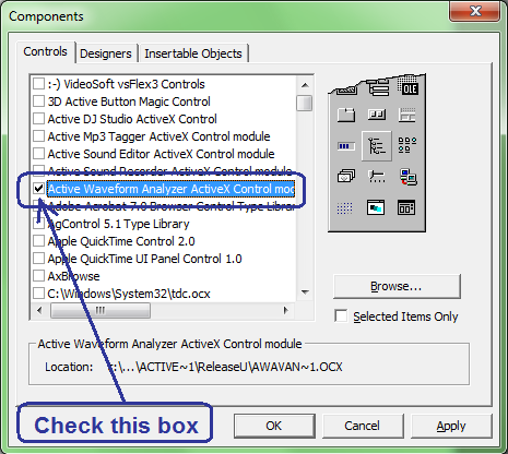 | • | From the "Controls" tab, check the "Active Waveform Analyzer ActiveX Control module" element as seen in the screenshot below: |
