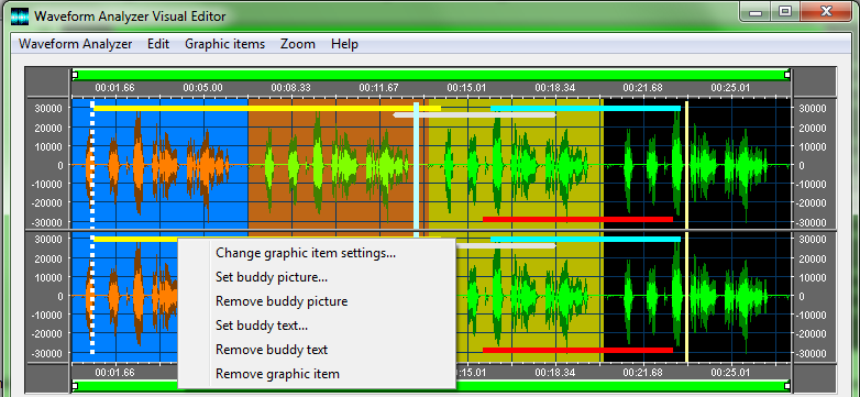 For details about graphic items management on the waveform analyzer refer to the How to add graphic items to the Waveform analyzer section.