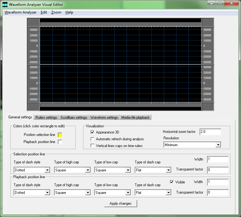 Graphical settings related to a specific waveform scroller can be retrieved and modified through the WaveformScroller.SettingsGet and WaveformScroller.SettingsSet methods: both of them receive in input a WSCROLLER_SETTINGS data structure. You can also set a background picture to be displayed under the waveform through the WaveformScroller.SetBackPictureFromFile and WaveformScroller.SetBackPictureFromHandle methods.